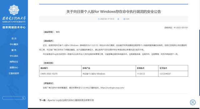 而西安电子科技大学信息网络技术中心也发出了官方公告,证实了向日葵远控软件确实存在命令执行漏洞,可以让有心之人通过这个漏洞远程获取电脑或者服务器的控制权,建议用户可以自行检查版本,确认是否有问题。