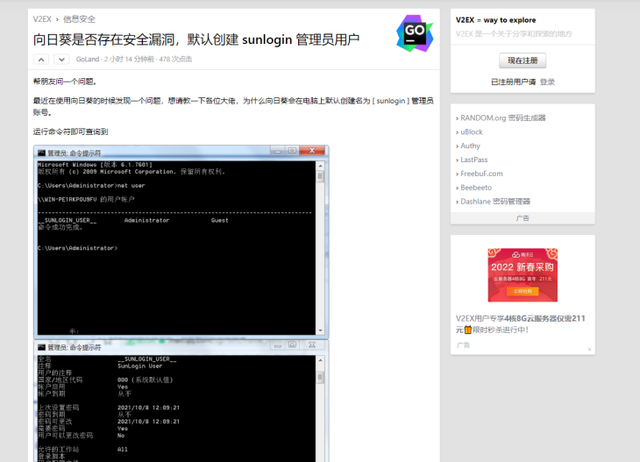 远控软件向日葵被曝安全漏洞,官方点名批评,让用户何去何从?来源:科技梦 远程办公逐步成为主流办公模式的今天,远控软件是远程办公的刚需软件,但近日远控软件向日葵却被曝出安全性问题,引发对向日葵远控软件的思考。 近日在知名程序员内部论坛V2EX上,有网友发帖称「向日葵是否存在安全漏洞,默认创建sunlogin?」引发关注,向日葵远控为什么可以自行创建一个管理员账号?大家都知道,管理员账号对电脑有着权限管理的作用,可以管理电脑中大大小小的资料文件、修改电脑资料等等。